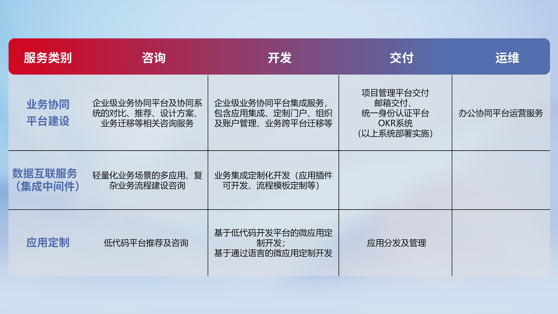 针对钉钉、、企微、、、、IDaas等平台级产品提供产品的规划、、、、方案、、、交付、、定制化开发等服务,,,,实现如统一协同办公、、、、智能客户服务、、、混合会议管理、、智能数据查询、、、等业务场景,,,,实现数字化转型。。。